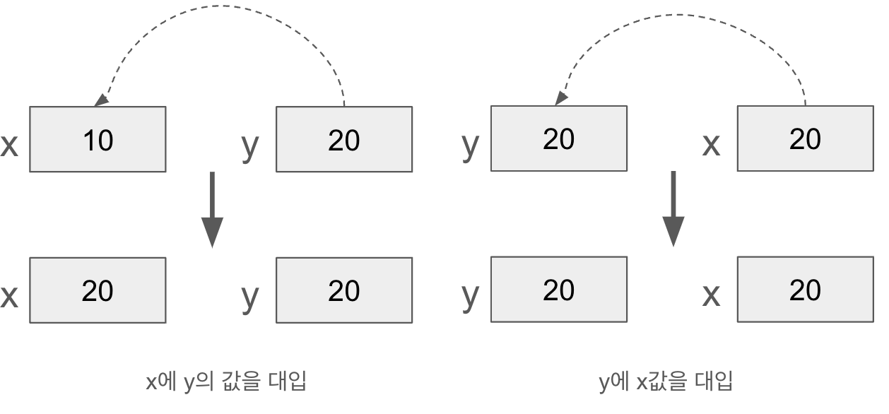 그리고 x에 y를 대입하고, 임시변수에 저장된 x의 값을 y에 저장하면 교환이 완료된다.int x = 10; int y = 20; int tmp;- 이후 순서는 아래 그림과 같다.