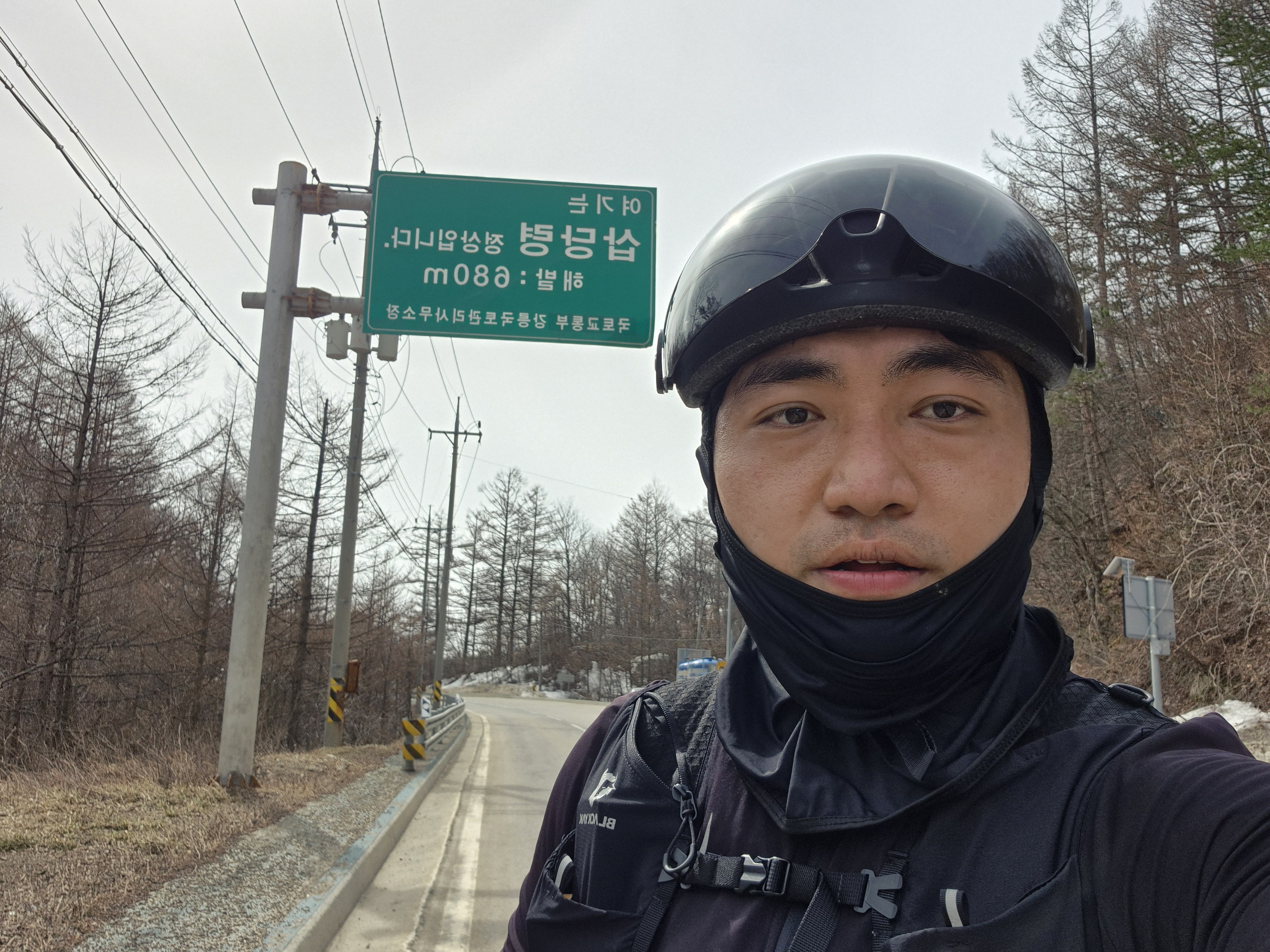 그래도 그렇게 힘든 경사도는 아니기에.. 꾸역꾸역 페달을 밟아 삽당령 정상에 올라 사진을 찍었다.