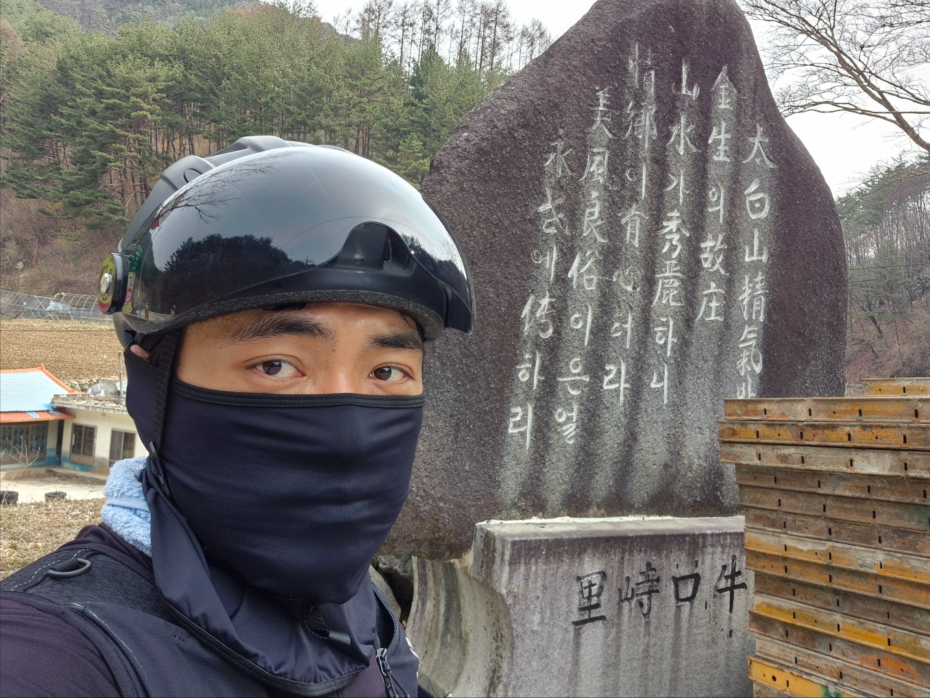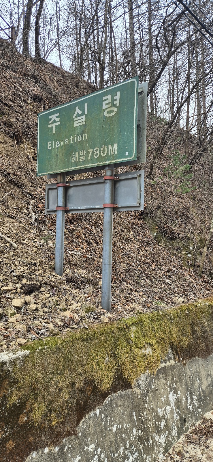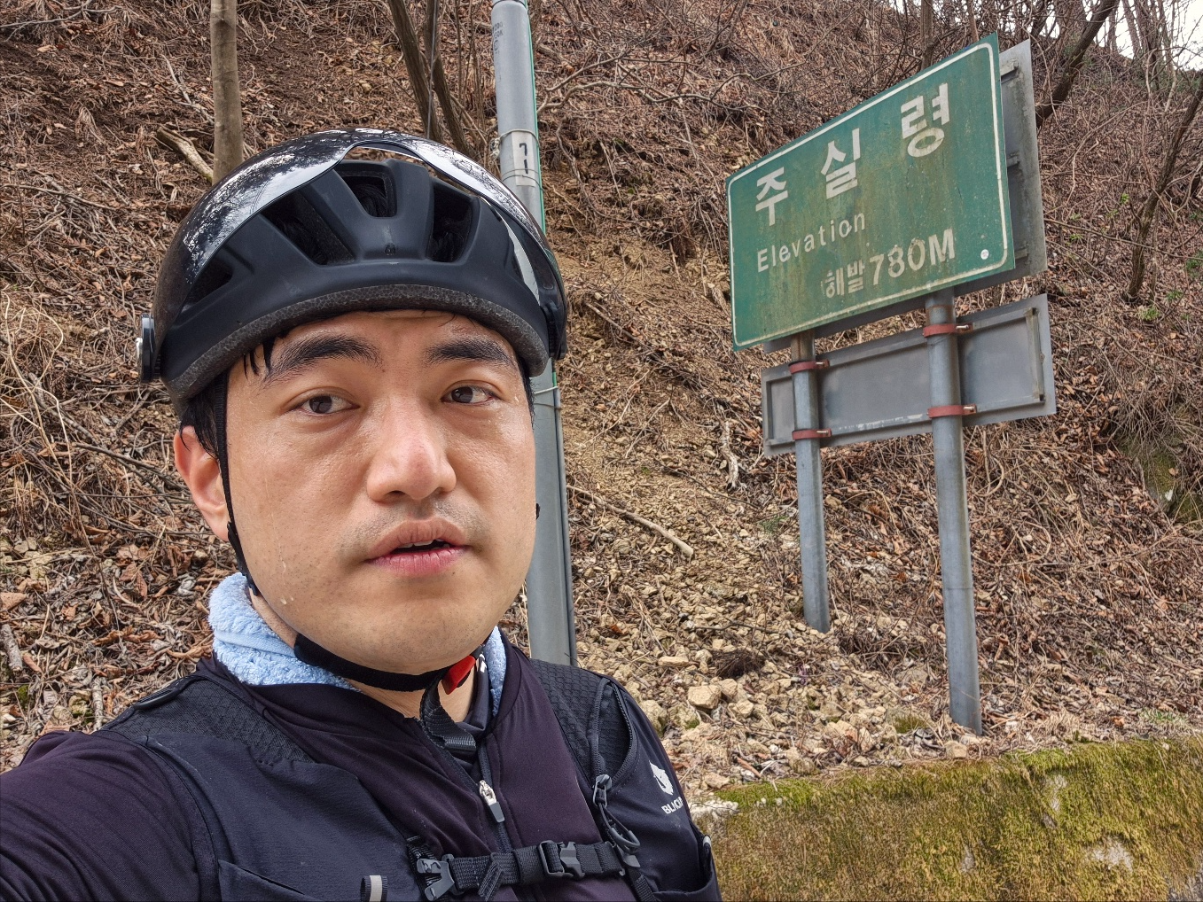 주실령에서 찍은 셀카 어느새 주실령에 도착하여 주실령의 비석에서 사진을 찍는다.