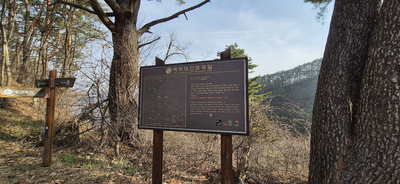 백두대간 트레일이라는 표지판과 그곳에서 본 산의 모습