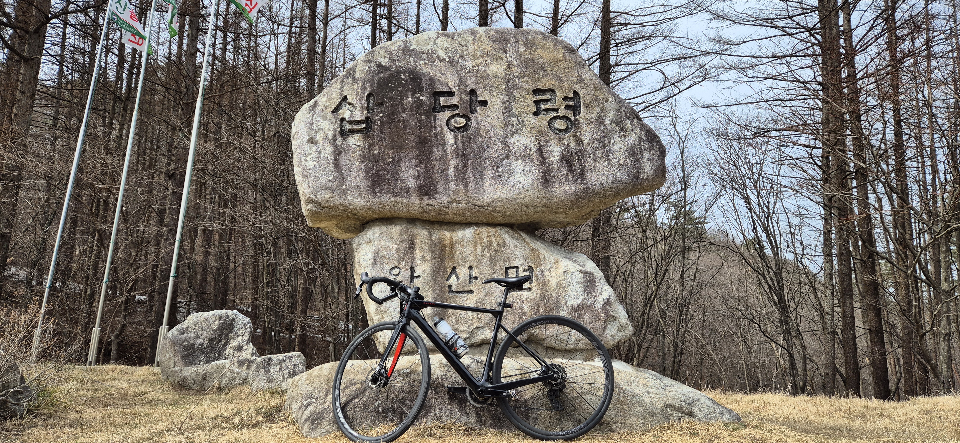 그래도 그렇게 힘든 경사도는 아니기에.. 꾸역꾸역 페달을 밟아 삽당령 정상에 올라 사진을 찍었다.