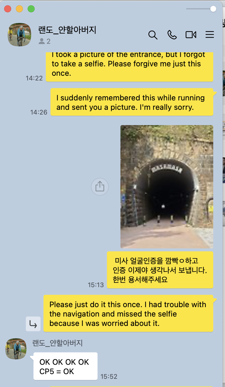 CP 지점인 터널앞에서 터널 사진만 찍고 인증사진을 까먹고 달리기 시작했다.