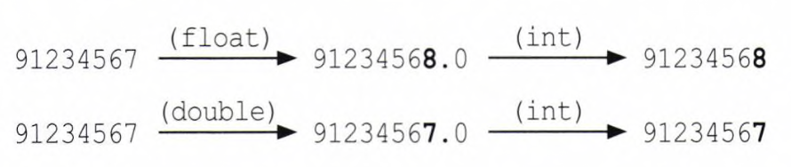 - 정수형의 최대값은 20억으로 10자리의 정밀도를 요구하지만, float는 10진수로 약 7자리의 정밀도만 제공하여 이로 인해 값이 달라짐
